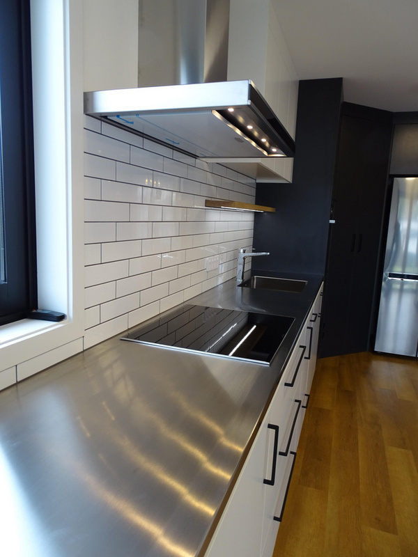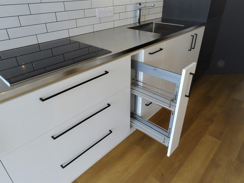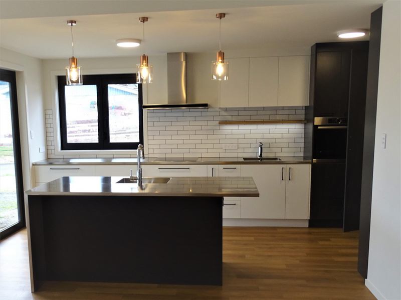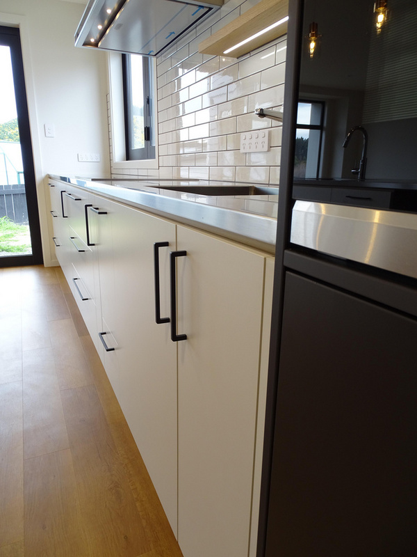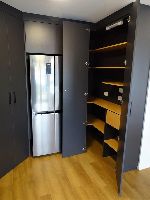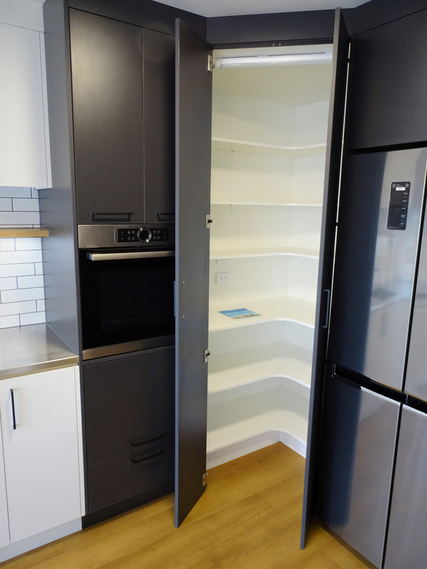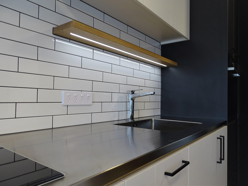 The lighting and black fittings on this kitchen cabinetry by Ron Kirk Joinery